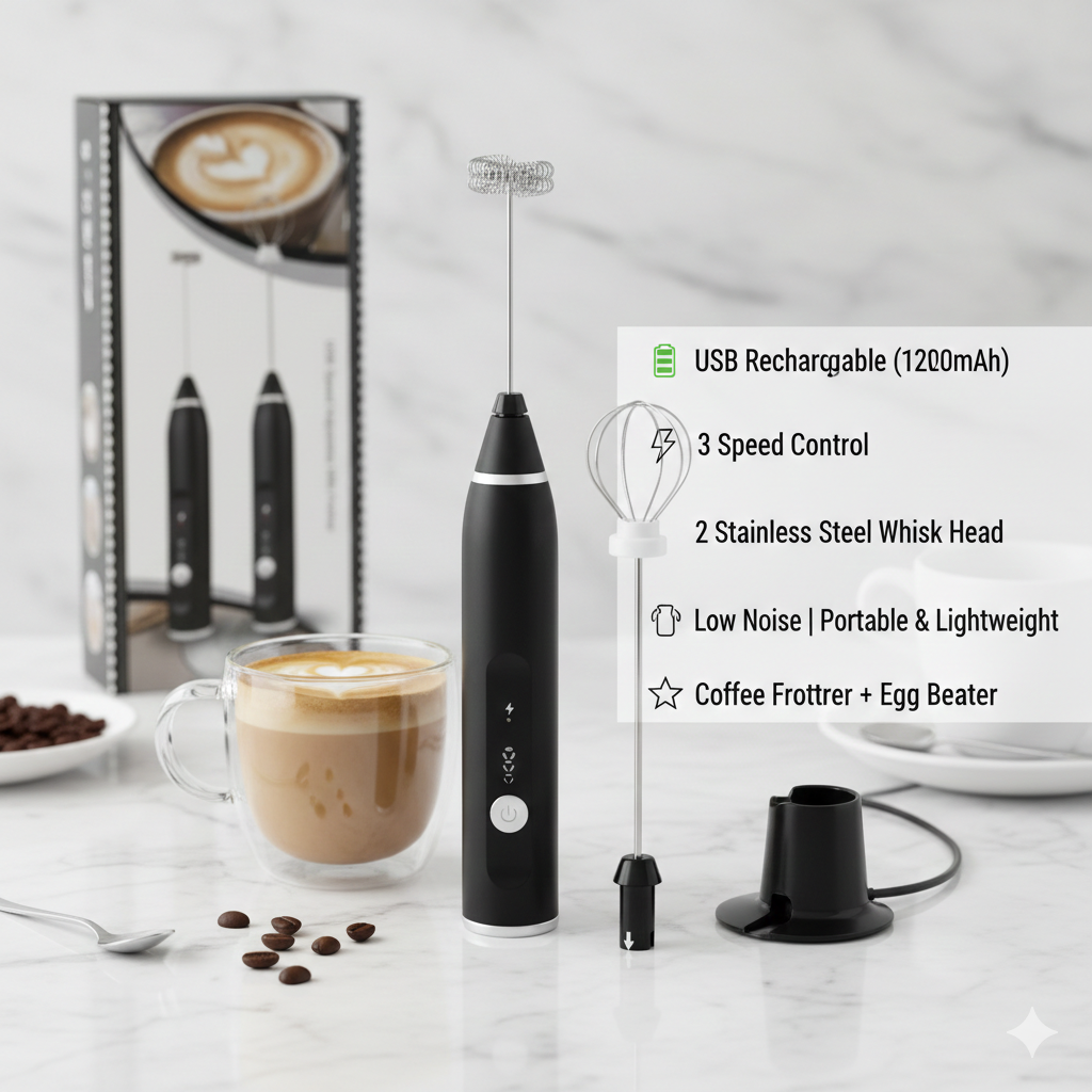 ছাড়Rechargeable Milk Frother & Egg Beater – USB Powered 3-Speed Electric Hand Mixer for Coffee, Cappuccino, Latte & Baking