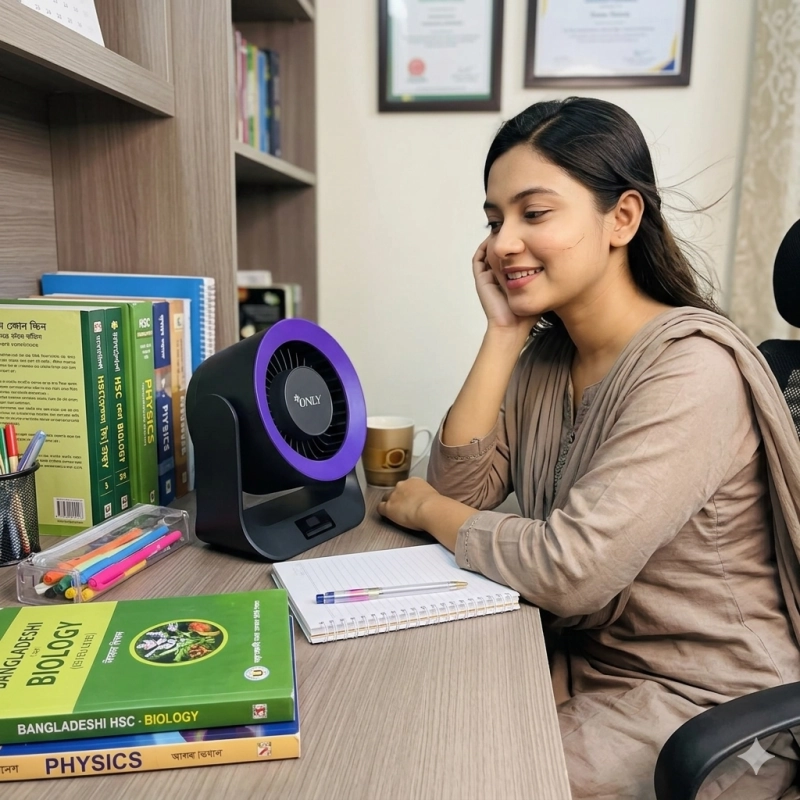 ফ্যানটি 360° ভার্টিক্যাল এঙ্গেলে ঘোরানো যায়, ফলে প্রয়োজন অনুযায়ী যেকোনো দিকে বাতাস দেওয়া যায়।